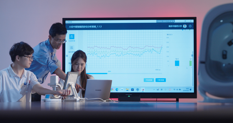 南京中医药大学师生调试智能脉诊仪。
