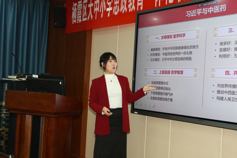 签约仪式后,学校思政课教师葛婷婷讲授了学校特色党课《习近平与中医药》部分章节,从习近平总书记关于中医药的重要论述入手,围绕中医药学作为中华文明“健康瑰宝、科学瑰宝、文化瑰宝”的内涵进行详细阐释。