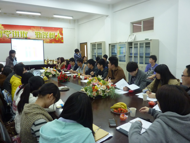 曹晨晓老师与耿凯老师首先代表双方院学生会做了简单的自我介绍,值得一提的是,友院的辅导员耿凯老师是毕业于基础医学院的校友,这一渊源也使交流现场气氛变得更为亲切融洽。随后,基础学生会主席钱丽超介绍了基础学生会的组织构架以及各部门的职能并阐释了这一组织架构的进步性。分管各中心的副主席分别介绍了我院学生会在这一组织架构下成功举办的仲景杯、义诊和迎新晚会这三项大型活动,并对活动中涉及的组织、赞助等问题进行了心得体会方面的交流。相应的,管理工程系团总支学生会也对其组织结构及活动概况做了简单的介绍。最后,两院学生会的相应职能部门的代表进行了一对一的自由交流,对各部门建设、管理进行了更加详尽的对话以改进自身的不足,双方均表示收益颇丰。