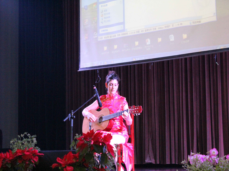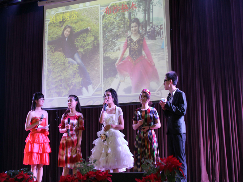 一曲激情四射的开场舞《最炫民族风》瞬间点燃了全场气氛。在风情介绍与互动环节中,回族、满族、维吾尔族的同学热情地和在场同学分享了少数民族的风土人情和民俗特色,国教院的越南、西班牙、日本、科摩罗、印尼的留学生同学则操着并不流利的中文兴奋的向在场同学介绍本国的地理风貌、文化、服饰、美食等,让同学们大开眼界,大呼过瘾,纷纷鼓掌称赞。应天学院倾情加盟的由《甩葱歌》、《baby》、《nobody》、《虫儿飞》等组成的一支动感雷人舞则把整台晚会推向了高潮。游戏环节——快乐传真由留学生,少数民族和在场同学混合组成三只队伍共同参与,运用丰富的肢体语言表演并猜出纸上的动作,虽然语言不通,但并不妨碍大家开心愉快的完成游戏,参与游戏的同学同时有幸尝到了由越南留学生带来的家乡美食。在随后的歌舞表演中,有西班牙留学生带来的妩媚的吉他弹唱,经管院姐妹花和兄弟组合带来的歌曲串烧,更有