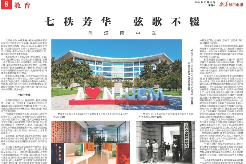 10月14日,《新华每日电讯》以《七秩芳华弦歌不辍——问道南中医》为题,整版报道了七秩南中医秉持“培养中医、提高中医”的初心使命,响应时代召唤、赓续岐黄薪火,在继承好、发展好、利用好中医药的道路上奋楫笃行。