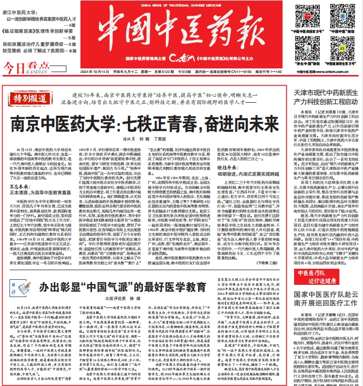 10月14日,《中国中医药报》发表评论员文章《办出彰显“中国气派”的最好医学教育》,展现南京中医药大学推进中医药教育改革的生动实践,突显学校的使命担当和前行方向。