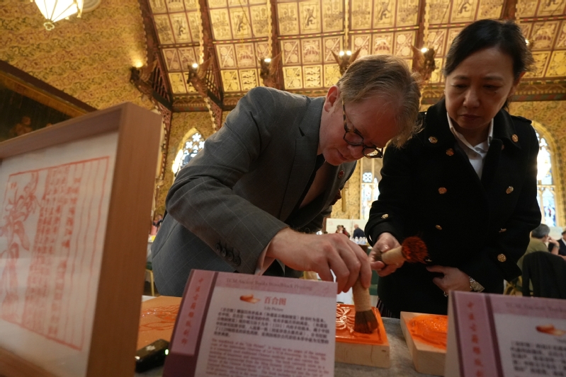 与会嘉宾认真了解中医药古籍与雕版印刷技艺并亲手体验制作