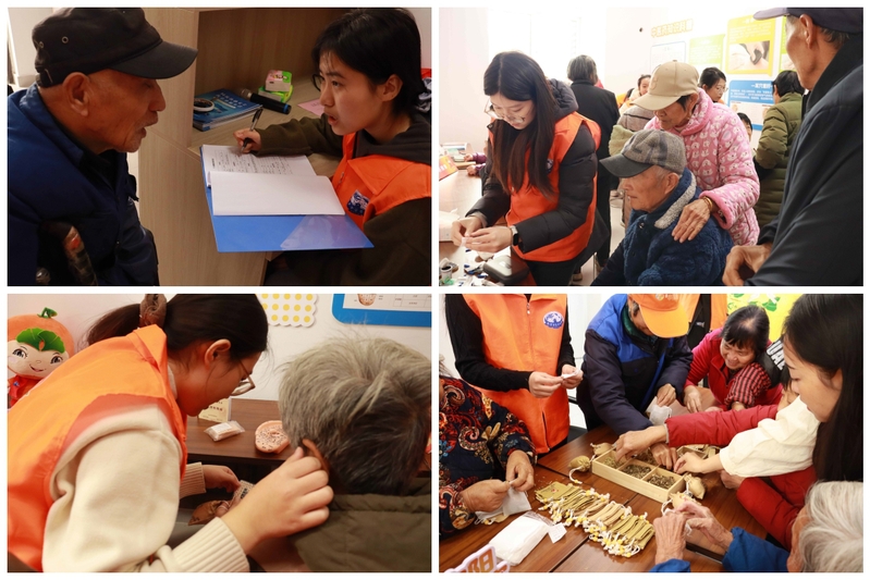 启动仪式结束后,一场沉浸式助老服务有序展开,志愿者们为老人建立起健康档案,开展量血压与测血糖,使用推拿手法帮助老人缓解肩颈和关节的劳损酸痛,指导老人耳穴埋籽,开展香囊教学与中草药知识讲解等。服务活动深受社区民众欢迎和好评。