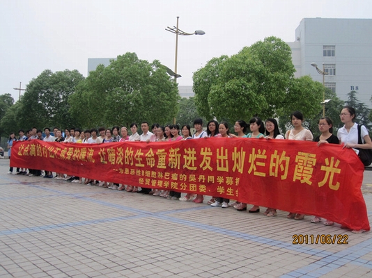 在得知吴丹同学的情况后,经贸管理学院党委筹划发起为吴丹同学爱心捐赠募捐活动,并向全校师生同学发出了募捐倡议书。这个倡议很快得到了全校广大师生的积极响应,大家纷纷献上一份爱心,一时间,爱的暖流汇聚校园,爱心在校园里传递。