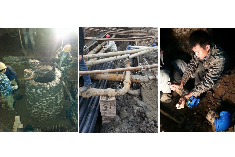 由于汉中门校区的地下管网始建于上个世纪50年代,之后又历经半个多世纪的更新改造维修,地下管网纵横交错,十分复杂。在一期工程的推进过程中,为落实学校领导“施工不得妨碍正常交通和学生学习生活秩序”的要求,汉管办领导在汉中门校区只有一条主干道的困难条件下,科学决策,精心组织施工,果断采取“半幅施工,半幅通行”的措施。由于该工程是“共沟不共管”,也就是说,不同类型的套管都放在统一开挖的管沟里,由各施工单位、各工种在同一狭小的作业面上分别交叉施工,施工难度非常大。特别是到了12幢至第一配电房之间的那20多米施工段,地下既有自来水的过街管道和T接分流管道,还有两路全校区的进线电缆和20多对出线电缆,更危险的是还有铸铁煤气主管道和T接的PE材质支管道,施工一度举步维艰。为打破僵局,实现春节前完工的目标,汉管办一方面要求施工方停用机械施工,改为人工小心挖掘,并与相关技术人员和施工单位研究解决方案;一方面协调港华燃气公司,要求燃气管改道并更换铸铁管;同时要求施工单位由北向南对向施工,确保施工工期。在多方协调下,燃气管改道并更换铸铁管的方案得到批准,更为可喜的是整个工程完全免费;自来水“多管合并、临时外接,绕行危险地段”的方案也得到顺利实施;工程进度进一步得到保证,南北对向施工的管网按时合龙。