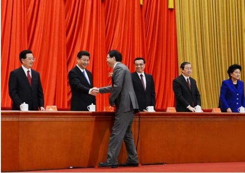 校友谢恬博士作为获奖代表上台领奖,荣幸地与党和国家主要领导人亲切握手