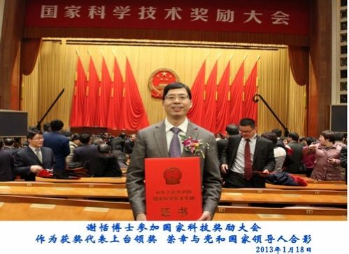 国家科学技术奖励大会于2013年1月18日上午在人民大会堂隆重举行,胡锦涛、习近平、温家宝、李克强、刘云山等党和国家领导人出席大会并为获奖代表颁奖。由谢恬、秦叔逵、孙燕、林洪生等专家完成的《榄香烯脂质体系列靶向抗癌天然药物产业化技术及其临床应用》荣获国家科技进步二等奖,我校客座教授、校友谢恬博士作为项目第一完成人出席了本次大会,得到了党和国家领导人的亲切接见和表彰。