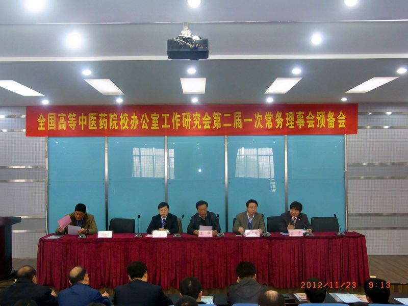 20121123,全国高等中医药院校办公室工作研究会第二届一次常务理事会预备会议在湖北中医药大学召开。研究会第一届理事会理事长、浙江中医药大学副校长张光霁、南京中医药大学副校长程海波和来自全国22所本科高等中医药院校办公室的主任们参加了会议。湖北中医药大学党委书记汪华、副校长王平应邀出席会议。