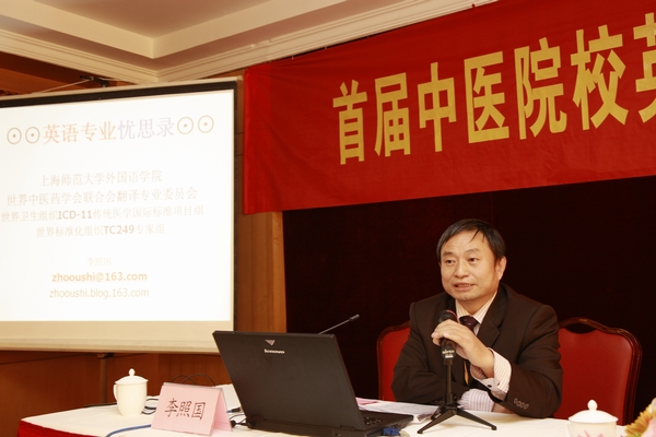 世界中医药联合会翻译委员会副会长兼秘书长、著名中医外语翻译家李照国教授作了主题报告“英语专业忧思录”。李照国教授从传统国学的角度,提出了我国英语教学中存在的一个值得关注的普遍问题:三多一少,即外多中少,语多文少,术多学少。他还通过翔实的例证强调了学好中文对于学好外文、做好翻译的重要性,指出国语对于任何一个学科或研究都是一把不可缺少的阶梯或钥匙。李教授还藉此机会向大家介绍了WHO中医术语标准化的进展情况。李照国教授引经据典,辅以他所填的四字结构诗词,用幽默、风趣、生动的语言阐述他的观点,赢得了全场的阵阵掌声。