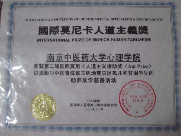 2010年7月26日,由心理学院党总支发起、全院教职工自愿捐资参与为青海省玉树地震灾区孤儿和贫困学生的助养助学活动正式启动,同时学院由此而荣获了国际华人医学家心理学家联合会颁发的第二届国际莫尼卡人道主义援助奖。青海省玉树县2010年4月14日发生地震后,我校心理学院教职工时刻关注着玉树的灾情,寻找合适的机会为他们提供亟需的帮助。国际华人医学家心理学家联合会在玉树地震几天后就发起了对玉树孤儿与贫困生进行一对一的助养助学活动,是其青海省玉树“414”地震灾后援助项目之一。学院杜文东教授和沈永健院长分别是该联合会的副理事长和常务理事,得知这个消息后,立刻向全院教职工介绍了该活动的情况,并以党总支的名义号召大家积极参与、自愿捐资,以心理学院爱心小组的名义集体为灾区孤儿奉献爱心,全院教职工了解情况后,都纷纷慷慨解囊。
