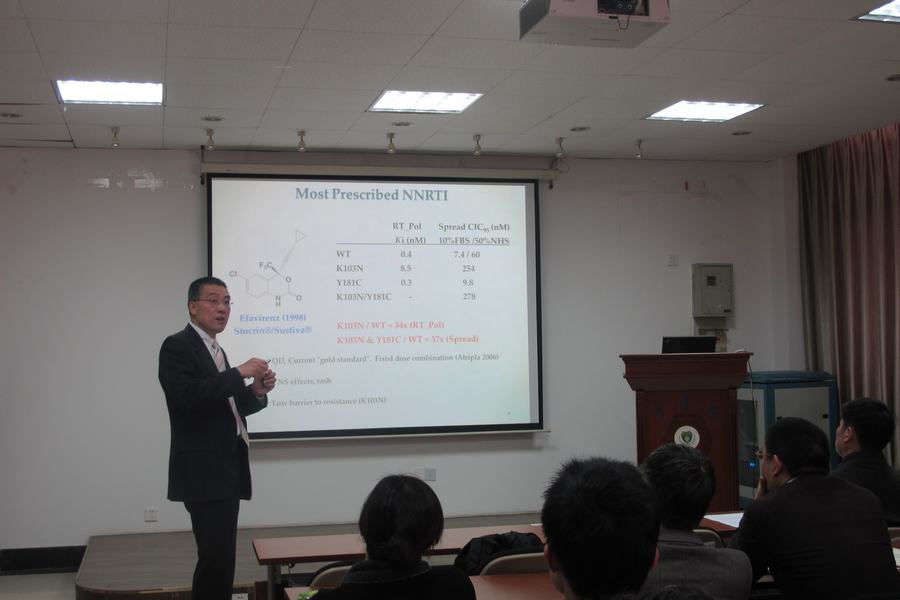 328上午,药学院校庆学术讲座系列活动在B1-303会议室举行,本次主讲嘉宾为我校杰出校友苏达世教授。苏教授为学院广大师生作了一场题为“美国新药研发的近况和挑战及抗艾滋病新药研发: 非核苷逆转录酶抑制剂 (NNRTI)”的学术报告。