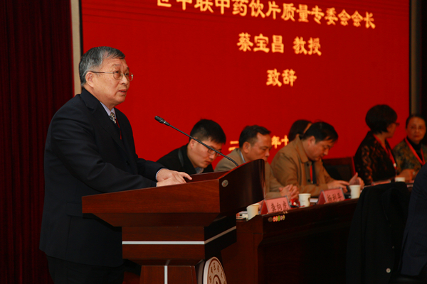 世中联中药饮片质量专业委员会会长蔡宝昌教授致辞、并作大会报告