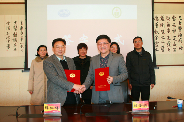 谭仁祥副校长(前左)与刘金洪院长(前右)签署合作协议