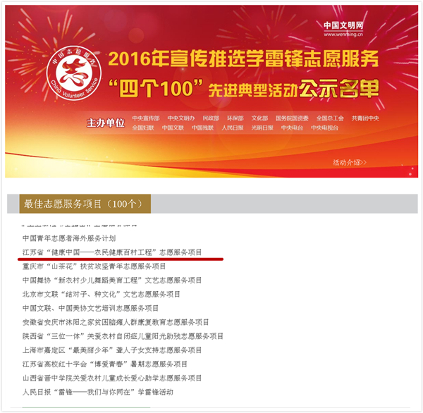 由中央宣传部、中央文明办、民政部、环保部、文化部、国务院国资委、全国总工会、共青团中央、全国妇联、中国文联、中国残联、人民日报、光明日报、中央电台、中央电视台等11部门组织的“开展2016年宣传推选学雷锋志愿服务四个100先进典型”评选活动于1月22日揭晓入围名单,我校组织开展的“健康中国——农民健康百村工程”志愿服务项目,喜获“全国学雷锋志愿服务四个100先进典型——最佳志愿服务项目”称号。