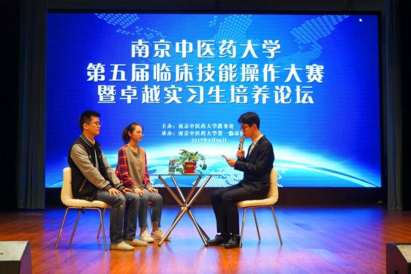 在开展竞赛的同时,学校为帮助2013级中医学子适应毕业实习及临床轮训,在大学生活动中心举办了“卓越实习生培养论坛”,附属医院科教科老师、优秀实习生开展了经验交流活动。科教科老师向实习生代表进行了授牌授褂、并重温《大医精诚》。