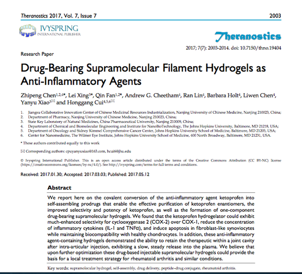 近期,药学院陈志鹏副教授课题组在国际医学科学领域知名期刊发表了题为“Drug-Bearing Supramolecular Filament Hydrogels as Anti- Inflammatory Agents”(Theranostics 2017, 7 (7): 2003-2014)的研究论文,该期刊最新影响因子为8.854。论文是在该课题组前期关于多肽药物结合物的研究基础上(J of controlled release, IF 7.266, 2014),针对如何实现小分子药物关节腔注射后发挥长效作用的难点,首次采用多肽药物结合物自组装构建纳米药物的策略,构建了用于关节腔注射治疗风湿性关节炎的长效纳米药物,阐明其自组装机制、长效机制及其在体内的药物动力学行为,为小分子化合物制备关节腔注射用长效制剂提供一个全新的方向。