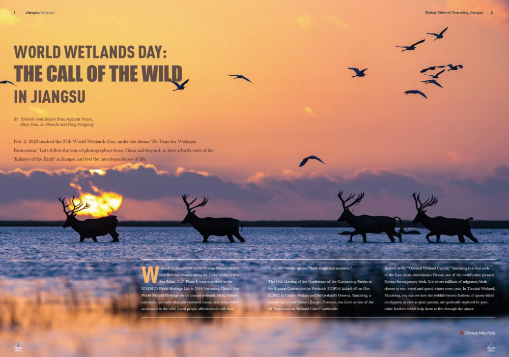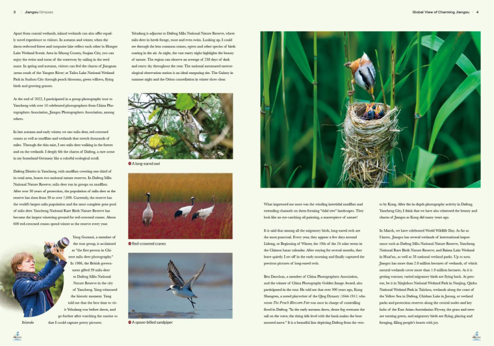 2023年2月2日是第27个“世界湿地日”。3月3日“世界野生动植物日”到来,4月1日“国际爱鸟日”到来,4月8日“国际珍稀动物保护日”到来,4月22日“世界地球日”到来……春日里,关爱地球生命的纪念日有不少。本期文旅指南“国际友人看江苏”栏目里,德国焦点图片社Yolanda vom Hagen跟随采风团走进“国际湿地城市”——盐城,记录下她在这里感受到的野性呼唤、诗意栖居和生命相依。