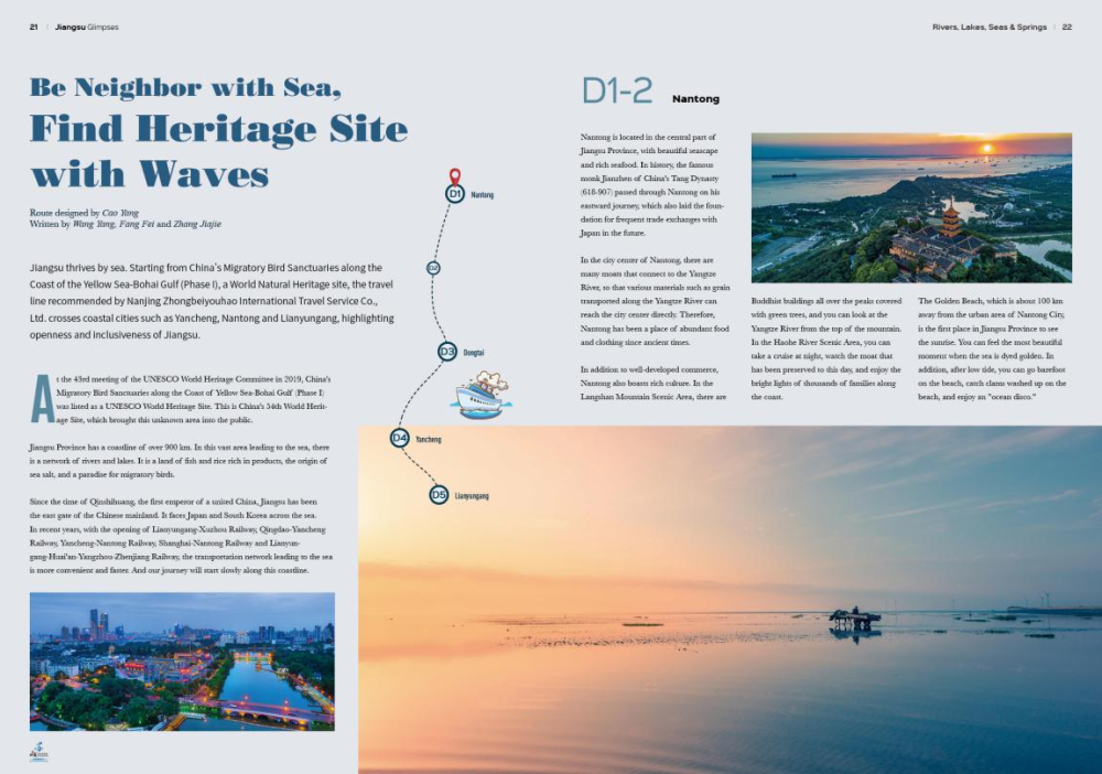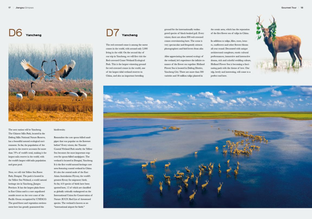 Yolanda在文旅指南里写道,同行采风摄影师告诉她不少在“国际湿地城市”盐城的摄影窍门。“大丰的杨国美老师告诉我,野鹿荡最好凌晨去,看完日出后再往深处走可以拍到很美的画面。另一位同行的摄影师贲道春老师告诉我,创作了《桃花扇》的词曲家孔尚任300多年前曾经在大丰这一带治水,他笔下的盐城大丰是‘晓雾漫帆秋波润,早潮平岸夜船移’。我能感觉到这是非常美的诗句,在盐城大丰深度采风后,我觉得如今的我们和孔尚任一样,看到了水韵江苏如诗如画般丰饶丰沛。”