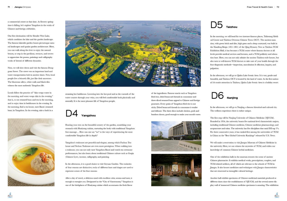 南京中医药大学青年教师徐天成说,文旅指南图文并茂地描述了江苏省中医药博物馆展陈出的中医药文化。“博物馆里的江苏中医馆还原了中国古代草药店的场景。中药馆几米高的浸制中药标本陈列墙令人震撼,并还原了中药炮制的场景,由中药百子柜及处方桌形成联动的经典处方学习体验平台给人以身临其境的感受。在养生文化馆内,还可在专业老师的示范下,学习八段锦、五禽戏、太极拳等传统健身功法,了解针灸文化和药食同源,更可以在悠悠古琴、淡淡药香中深度体验中医养生文化的丰富内涵,相信会吸引更多全球读者触摸江苏中医药奔腾不息的脉搏。”